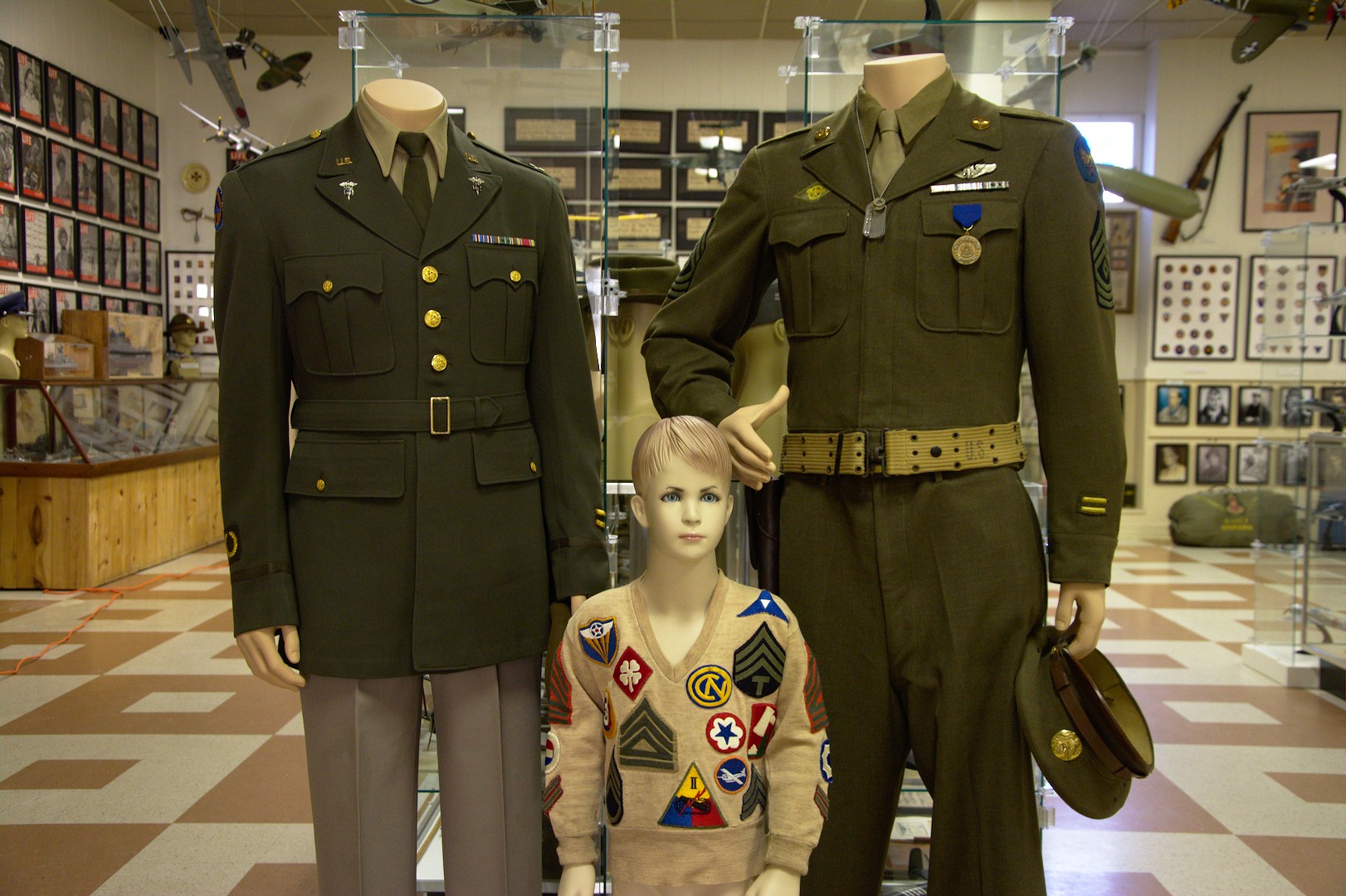 Six year old Bobbie Hinshaw wearing the original WW II sweater on which his grandmother sewed patches given to him by soldiers and Marines on the troop trains from California to Kansas in 1942. He is with Capt. Everett King of the 44th Infantry Division and Sgt Arthur Mills of the 464th Bomb Group who was a POW in Germany.