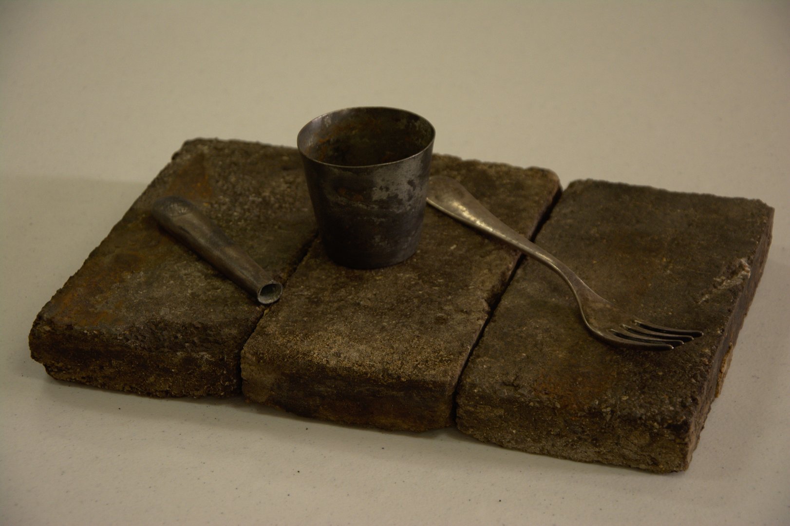 Original cup, knife handle and fork from the crash site of the Hindenburg sitting on original bricks from the floor of Hanger 1, the Hindenburg's home at Lakehurst NAS in the 1930s.