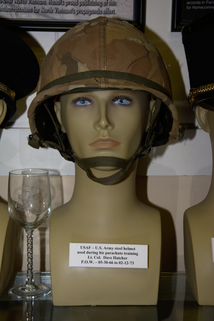 US Air Force/US Army steel helmet used during parachute training by Lt. Col. Dave Hatcher, POW 05-30-1966 to 02-12-1973.