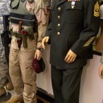 Current combat fatigues for Lance Corporal Sean Montgomery, USMC, currently serving in combat in Afghanistan. On the right are the summer service tans for Captain Jim Mcdonough, US Army, killed in Action in Vietnam on his second tour.